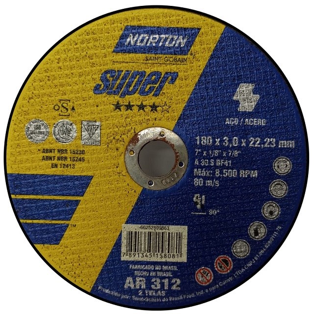 Disco de Corte Abrasivo Para Aço E Inox 180 X 3,0 X 22,23mm Super Ar 312 Norton