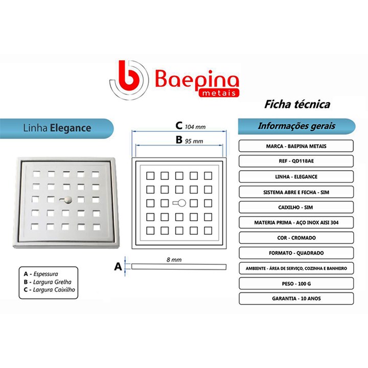 Grelha Inox 304 Para Ralo E Caixa Sifonada Quadrada 100mm Com Fecho E Caixilho Elegance Qd118ae Baepina