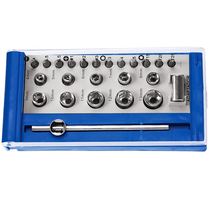 Jogo de Soquetes Aço Carbono Encaixe 1/4" 24 Peças (1 Haste T , 1 Dadptador, 12 Ponteiras, 10 Soquetes E Estojo) 41192/024 Tramontina