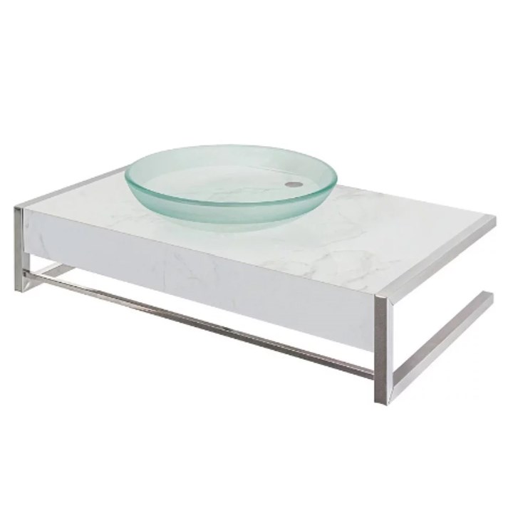 Lavatório Cuba de Vidro Tampo Em Porcelanato Marmorizado Branco 71x42cm 921 Estrutura Em Aço Inox Crismetal